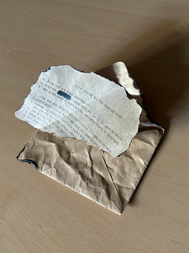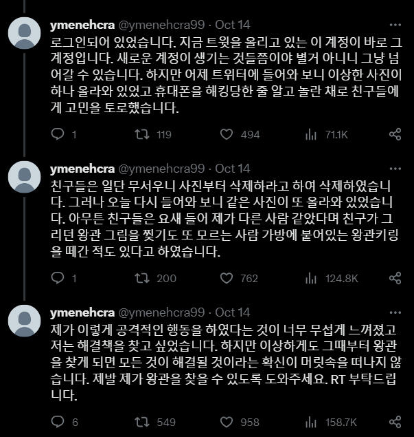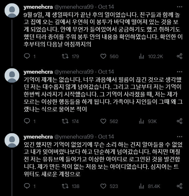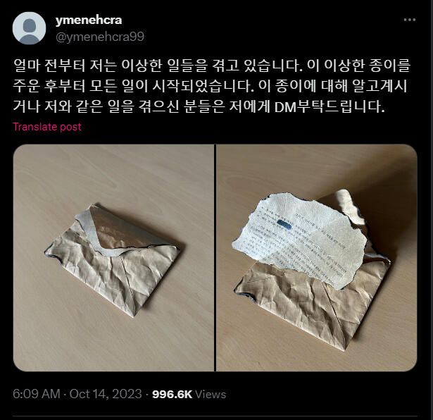 Korean:얼마 전부터 저는 이상한 일들을 겪고 있습니다. 이 이상한 종이를 주운 후부터 모든 일이 시작되었습니다. 이 종이에 대해 알고계시거나 저와 같은 일을 겪으신 분들은 저에게 DM부탁드립니다.9월 9일, 제 생일파티가 끝난 후의 일이었습니다. 친구들과 함께 놀고 집에 오는 길에서 우연히 이 봉투가 바닥에 떨어져 있는 것을 보게 되었습니다. 안에 무언가 들어있어서 궁금하기도 했고 취하기도 했던 터라 종이를 주워 봉투 안의 내용을 확인하였습니다. 확인한 이후부터의 다음날 아침까지의기억이 제게는 없습니다. 너무 과음해서 필름이 끊긴 것으로 생각했던 저는 대수롭지 않게 넘어갔습니다. 그리고 그날부터 저는 기억이 한번씩 사라지기 시작했습니다. 그 기억이 사라졌을 때, 저는 제가 모르는 이상한 행동들을 하게 됩니다. 가족이나 지인들이 그때 왜 그랬냐는 식으로 물어본 적이있긴 했지만 기억이 없었기에 무슨 소리 하는 건지 알아들을 수 없었고 내가 잊어버렸나보다 하고 단순하게 넘어갔습니다. 하지만 며칠 전 저는 유튜브에 들어가고 이상한 아이디로 로그인된 것을 발견합니다. 제가 만든 적이 없는 처음 보는 아이디였습니다. 심지어는 트위터도 새로운 계정으로로그인되어 있었습니다. 지금 트윗을 올리고 있는 이 계정이 바로 그 계정입니다. 새로운 계정이 생기는 것들쯤이야 별거 아니니 그냥 넘어갈 수 있습니다. 하지만 어제 트위터에 들어와 보니 이상한 사진이 하나 올라와 있었고 휴대폰을 해킹당한 줄 알고 놀란 채로 친구들에게 고민을 토로했습니다.친구들은 일단 무서우니 사진부터 삭제하라고 하여 삭제하였습니다. 그러나 오늘 다시 들어와 보니 같은 사진이 또 올라와 있었습니다. 아무튼 친구들은 요새 들어 제가 다른 사람 같았다며 친구가 그리던 왕관 그림을 찢기도 또 모르는 사람 가방에 붙어있는 왕관키링을 떼간 적도 있다고 하였습니다.제가 이렇게 공격적인 행동을 하였다는 것이 너무 무섭게 느껴졌고 저는 해결책을 찾고 싶었습니다. 하지만 이상하게도 그때부터 왕관을 찾게 되면 모든 것이 해결될 것이라는 확신이 머릿속을 떠나지 않습니다. 제발 제가 왕관을 찾을 수 있도록 도와주세요. RT 부탁드립니다.Translation:For quite a while, I've been going through some strange occurrences. These strange things all started when I picked up this strange piece of paper. If there is anyone who knows about this paper or has been through something similar, please DM me.It was after my birthday party on September 9th. On my way home after hanging out with my friends, I happened to see this envelope on the floor. I was curious and drunk because there was something inside, so I picked up the paper and checked the contents inside the envelope.I had no memories of checking it, even from the next morning. I don't have any memories. I thought the film was cut off because I drank too much, but I didn't care. And from that day on, my memory began to fade. When that memory disappears, I do strange things that I don't know. My family and acquaintances asked me why I did that.I had done it, but I didn't remember, so I couldn't understand what they were talking about, and I simply moved on, wondering if I had forgotten. But a few days ago, I went onto YouTube and found myself logged in with a weird ID. It was my first time seeing an ID that I've never made it. Even my Twitter is using a new account.I was logged in. The account I'm tweeting about right now is the one. It's not a big deal to have a new account, so I can just move on. But, when I came onto Twitter yesterday, I saw a strange picture and I was surprised that my phone was hacked, and I told my friends about my concerns.My friends told me to delete the picture at first because they were scared. But when I came back in today, the same picture was posted again. Anyways, my friends said that I looked like a different person these days, and that I had taken off the crown key ring attached to a person's bag that I didn't even know about.It felt so scary that I was acting this aggressive, and I wanted to find a solution. But strangely enough, I can't seem to find peace until I find that crown and solve it all. Please help me find the crown. RT, please.